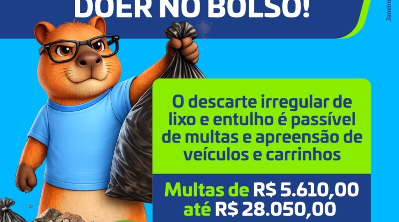 O combate aos porcalhões e ao descarte irregular de lixo, entulhos e outros resíduos, com multa e apreensão, tem amparo legal. De acordo com a Secretaria Municipal de Meio Ambiente e Serviços Urbanos (SMAS), a fiscalização se baseia na Lei Municipal nº 2.597/2007, na Lei nº 3.853/2019 – Gerenciamento de Resíduos Sólidos (de 1.000 UFD’s a 5.000 UFDs), e na Lei nº 455/2018 – Código de Convivência Urbana e na Lei de Crimes Ambientais.