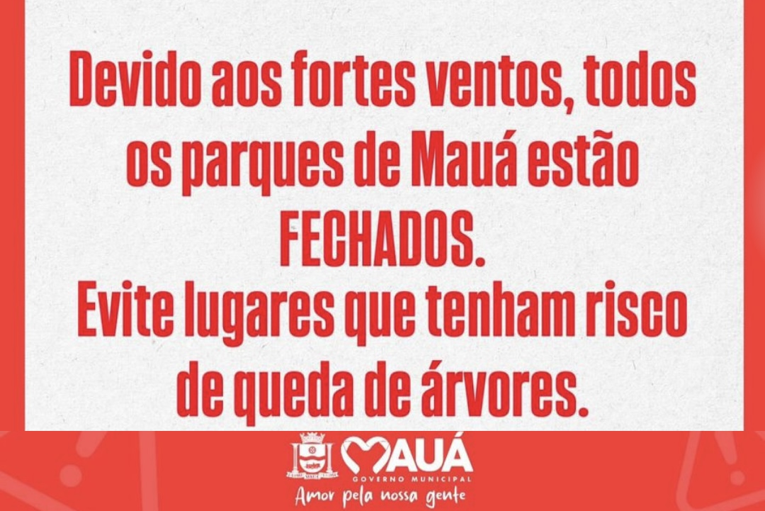 A Prefeitura de Mauá informa que, devido aos fortes ventos que atingem a região nesta quarta-feira (10) e visando garantir a segurança da população, todos os parques municipais estão temporariamente fechados: Parque da Gruta Santa Luzia, Parque Prefeito Oswaldo Dias e Parque da Juventude.